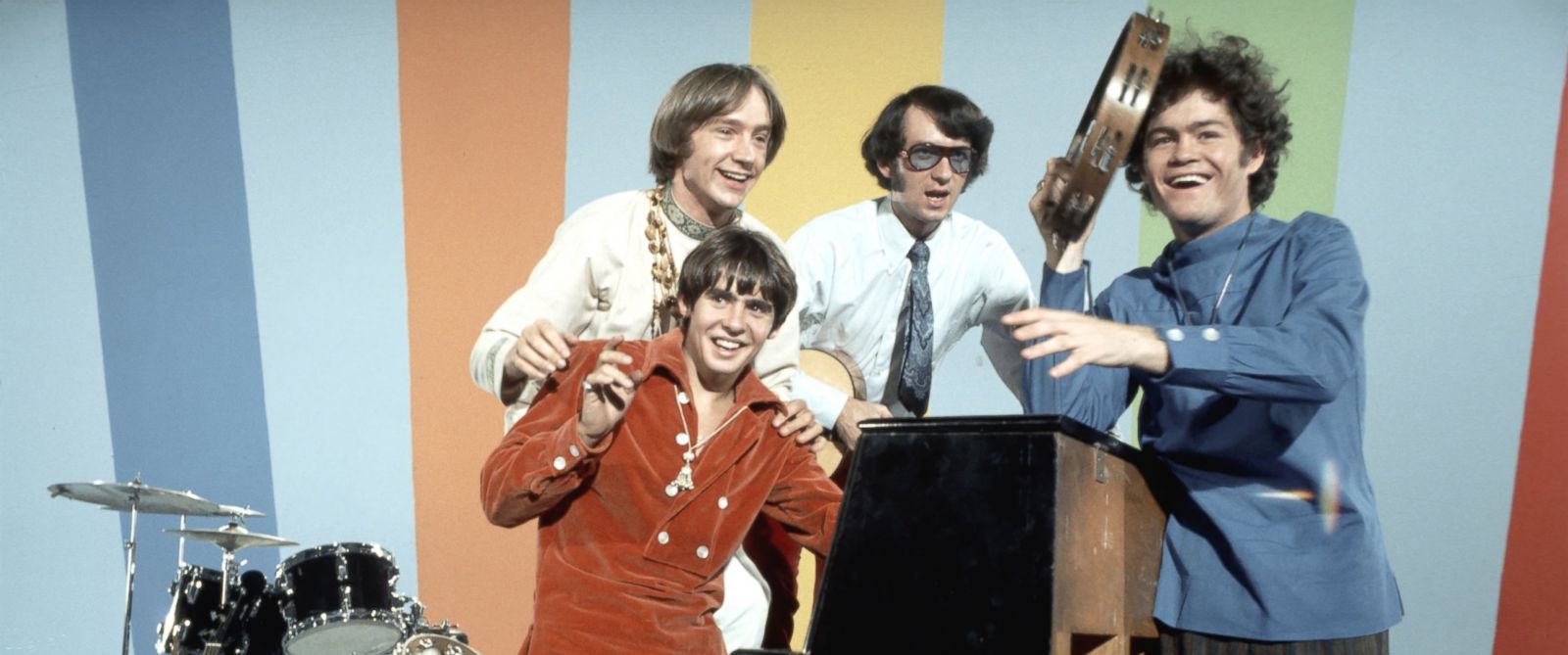 Description: A group of men standing next to each other near a podium with a microphone in front of them and a drum.