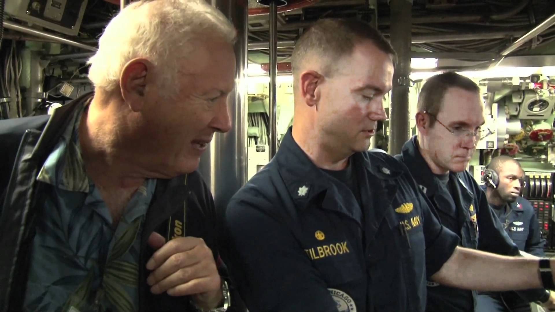Description: A group of men standing next to each other in a room with a clock on the wall and a man in a blue shirt.