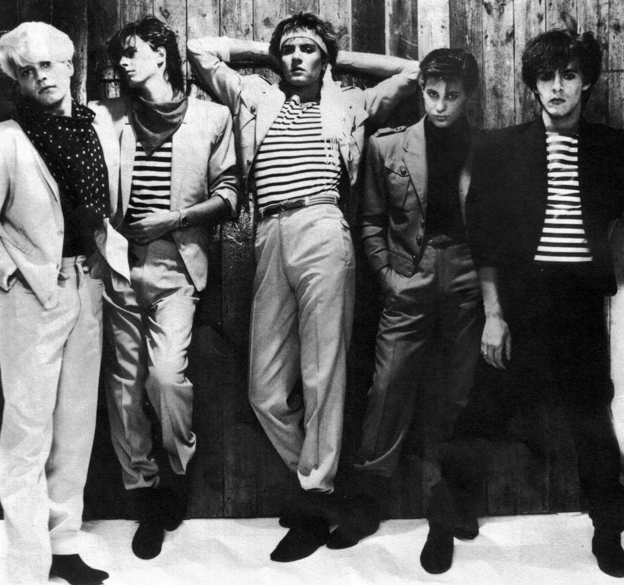 Description: A group of men standing next to each other in front of a wooden wall with a striped shirt on.