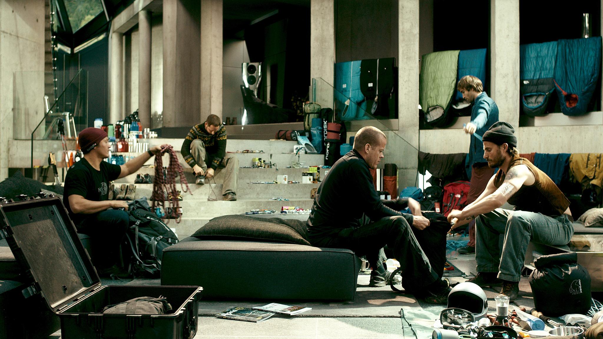 Description: A group of men sitting around a room with guitars and other items on the floor and a man standing in the background.