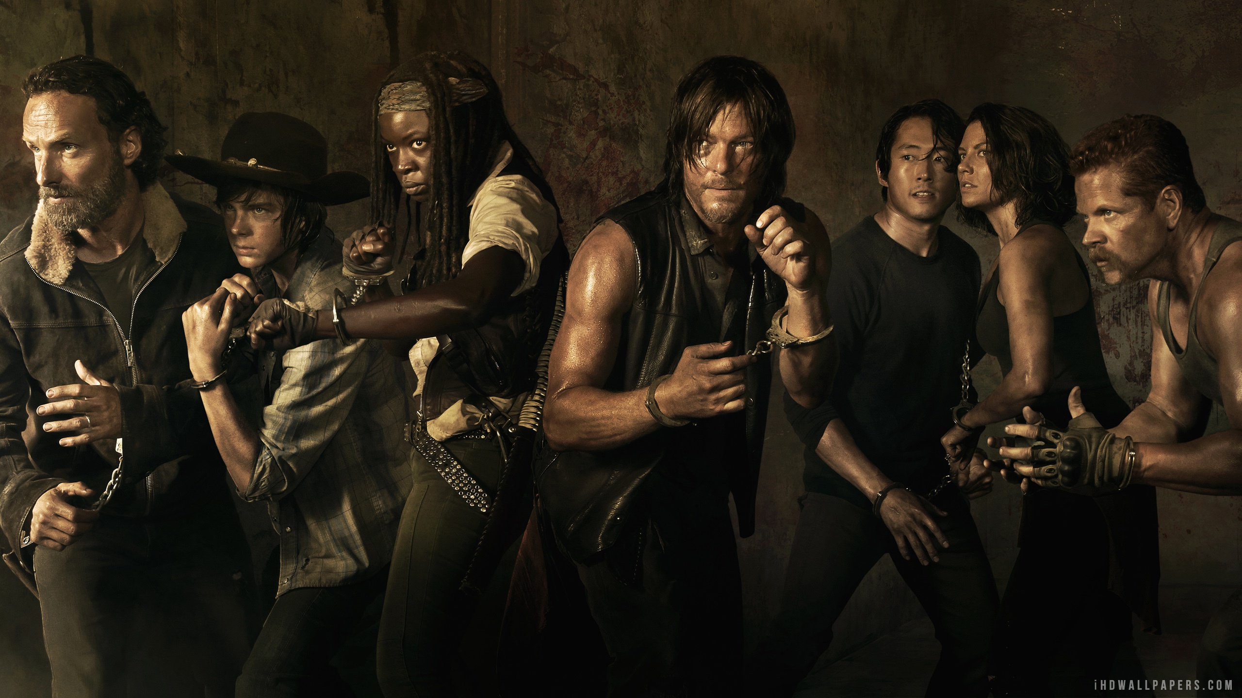 Description: A group of men standing next to each other holding guns and knives in their hands in a dark room.