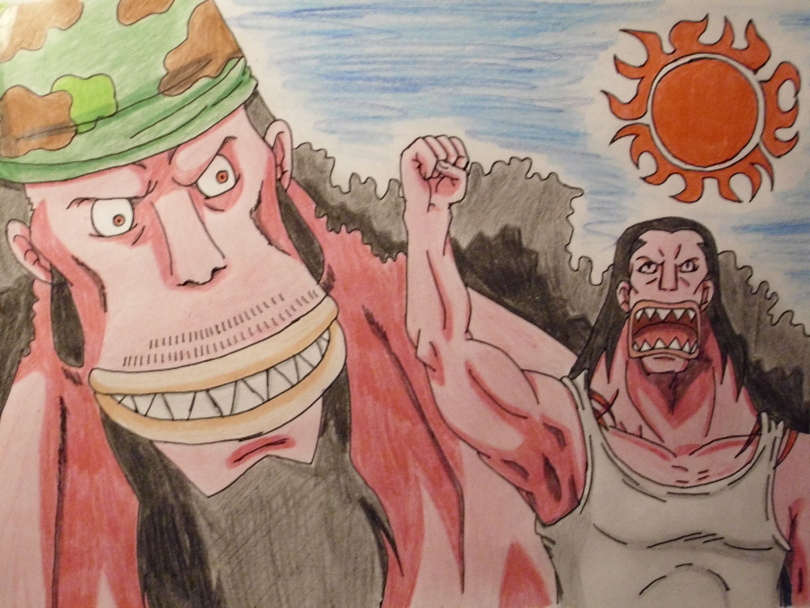 Description: A drawing of two men with a hat on their head and one holding a knife in his hand and the other holding a sun.