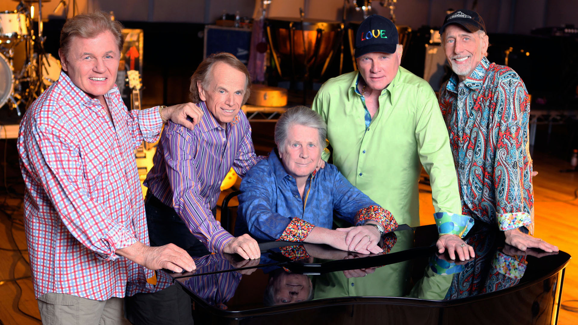 Description: A group of men standing around a piano in a room with a drum set on the wall behind them.