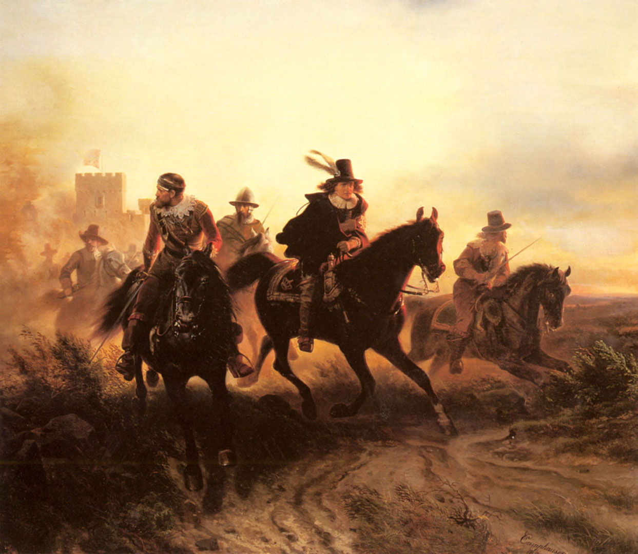 Description: A painting of a group of men riding horses in a desert landscape with a castle in the background and a sky in the background.