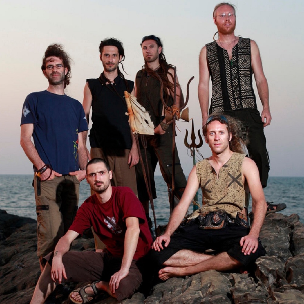 Description: A group of men sitting on top of a rock near the ocean with a boat in the background and a person standing in the foreground.