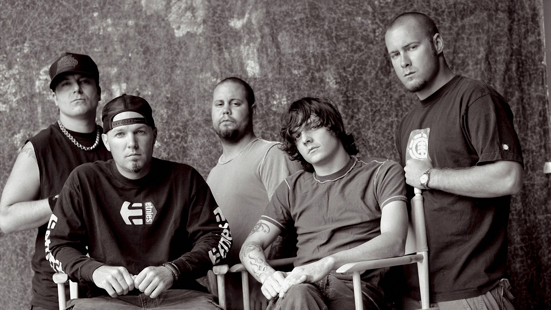 Description: A group of men sitting next to each other on a chair in front of a wall with a graffiti covered wall behind them.