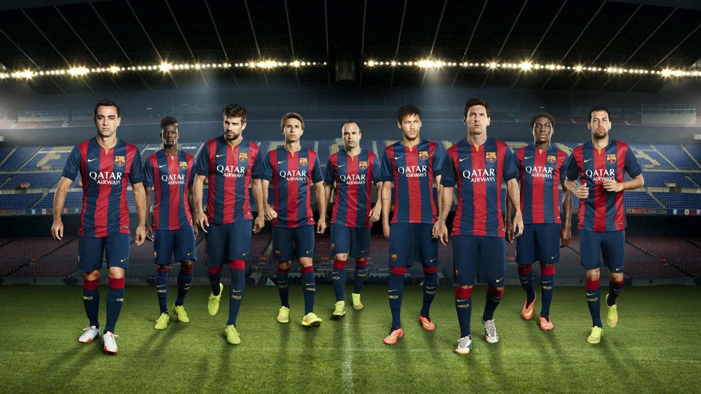 Description: A group of men standing on top of a soccer field in uniforms of different colors and sizes.