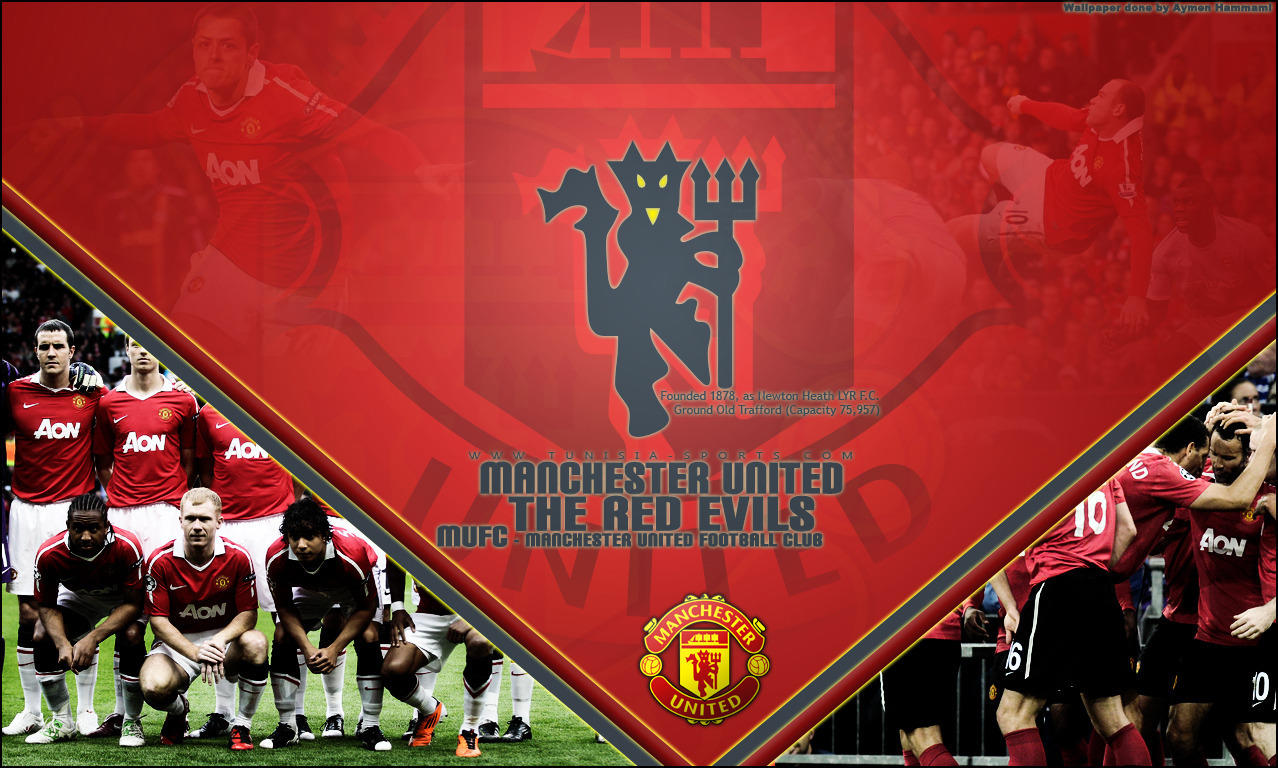 Description: A group of men standing next to each other on a field with a red banner behind them that says manchester united and the red devils.