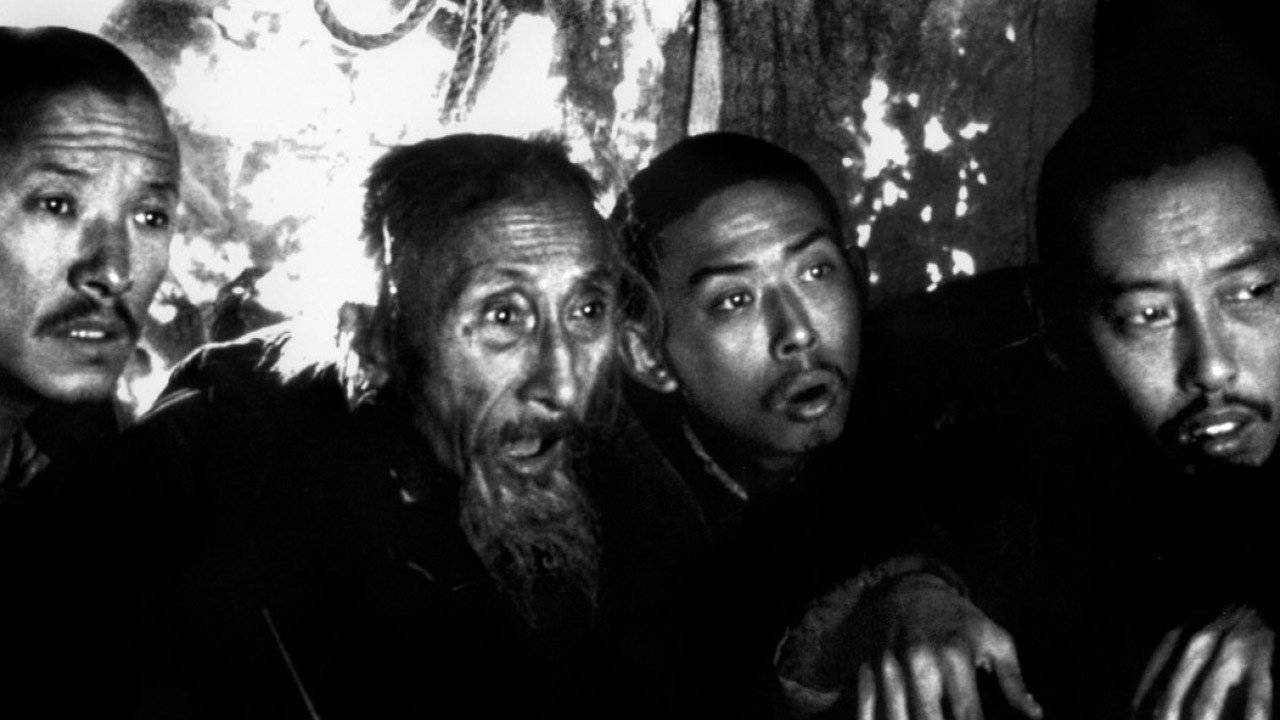 Description: A group of men standing next to each other in a room with graffiti on the wall behind them and one man holding a knife.