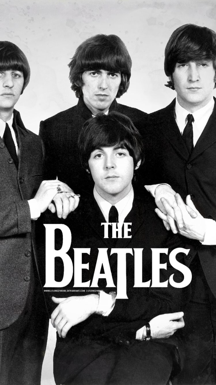 Description: A group of men standing next to each other in suits and ties with the beatles sign in front of them.