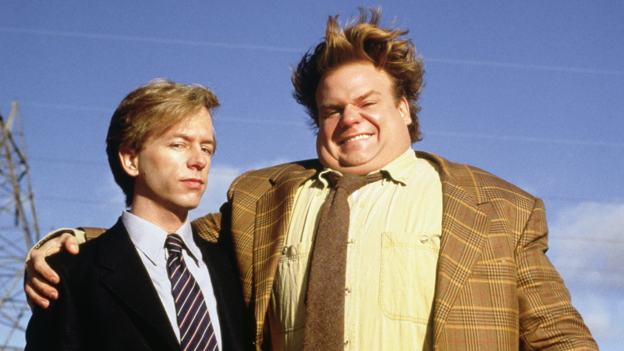 Description: Two men in suits and ties standing next to each other in front of a power line and blue sky.