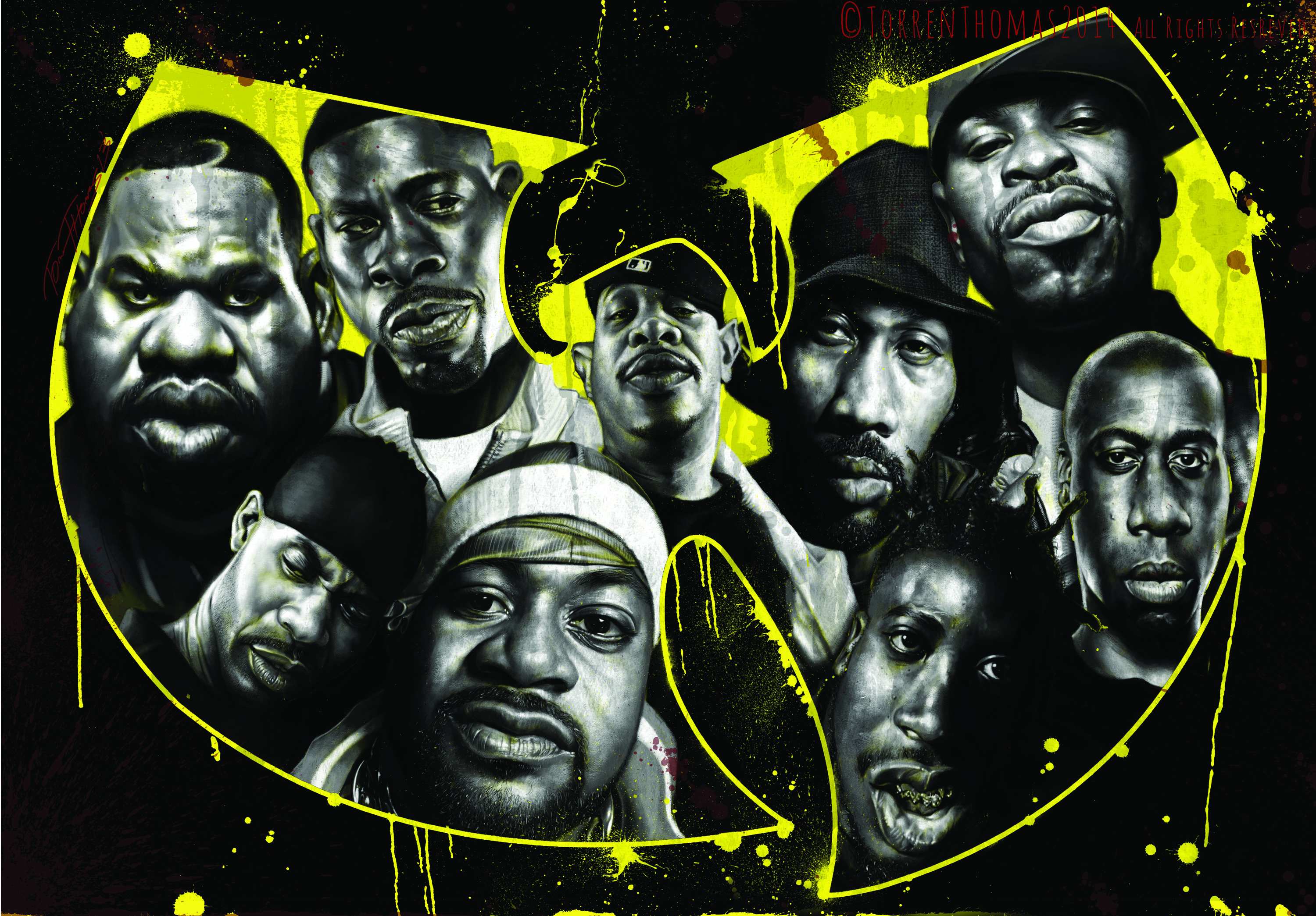 Description: A group of men with different facial expressions on a black background with yellow paint splatters and a yellow circle.