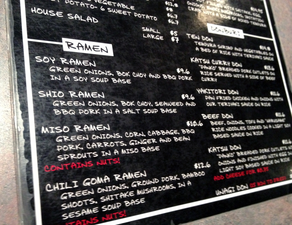 Description: A menu board with a lot of writing on it that is black and white with red lettering on it.