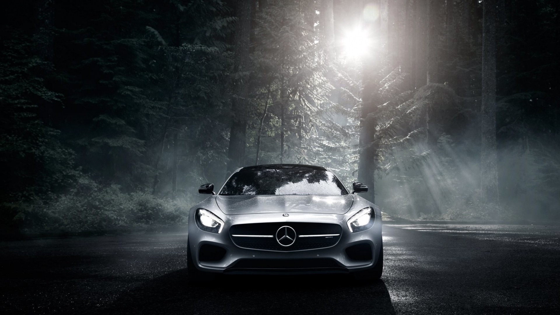 Description: A mercedes sports car driving through a forest at night with a bright light on the hood of the car.