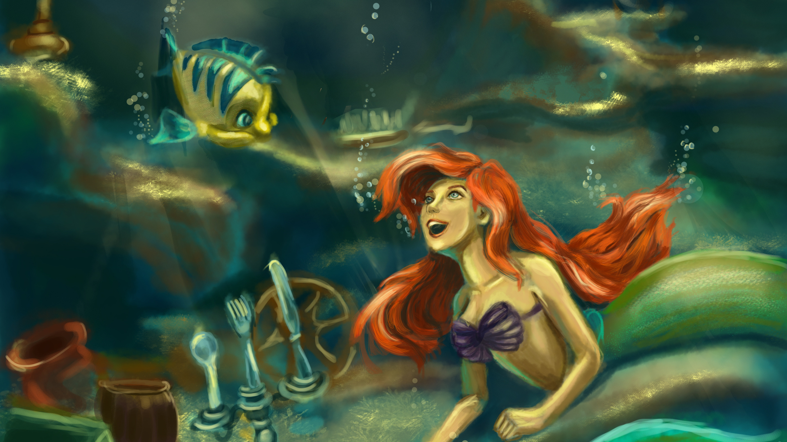 Description: A painting of a mermaid with a fish in her hand and a fish in the water behind her.