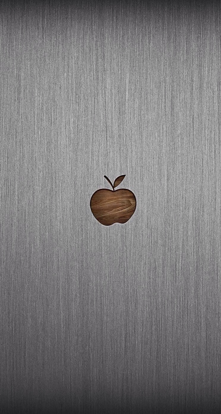 Description: A metal surface with a apple logo on it's side and a wooden apple on the side of the screen.