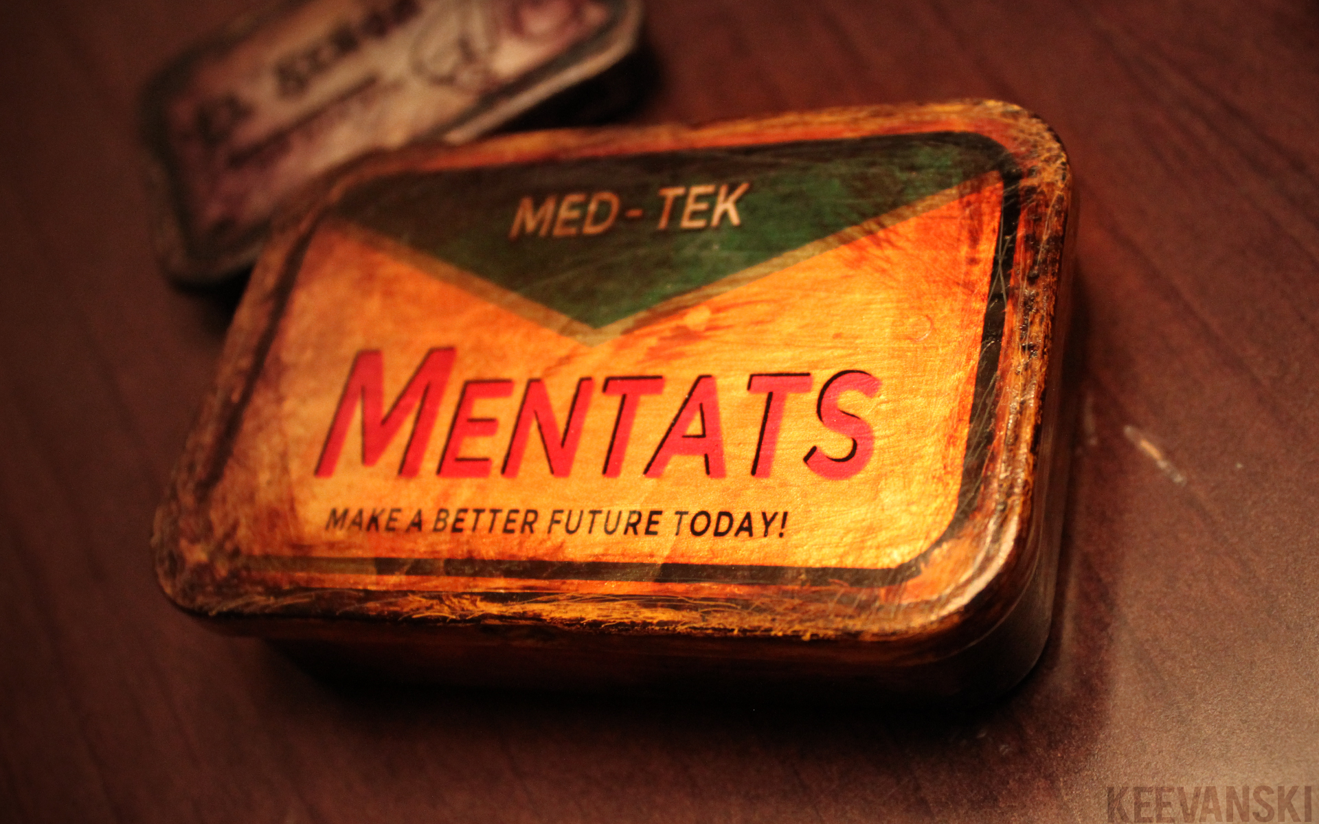 Description: A metal box with a message on it sitting on a table next to a cell phone and a wallet.