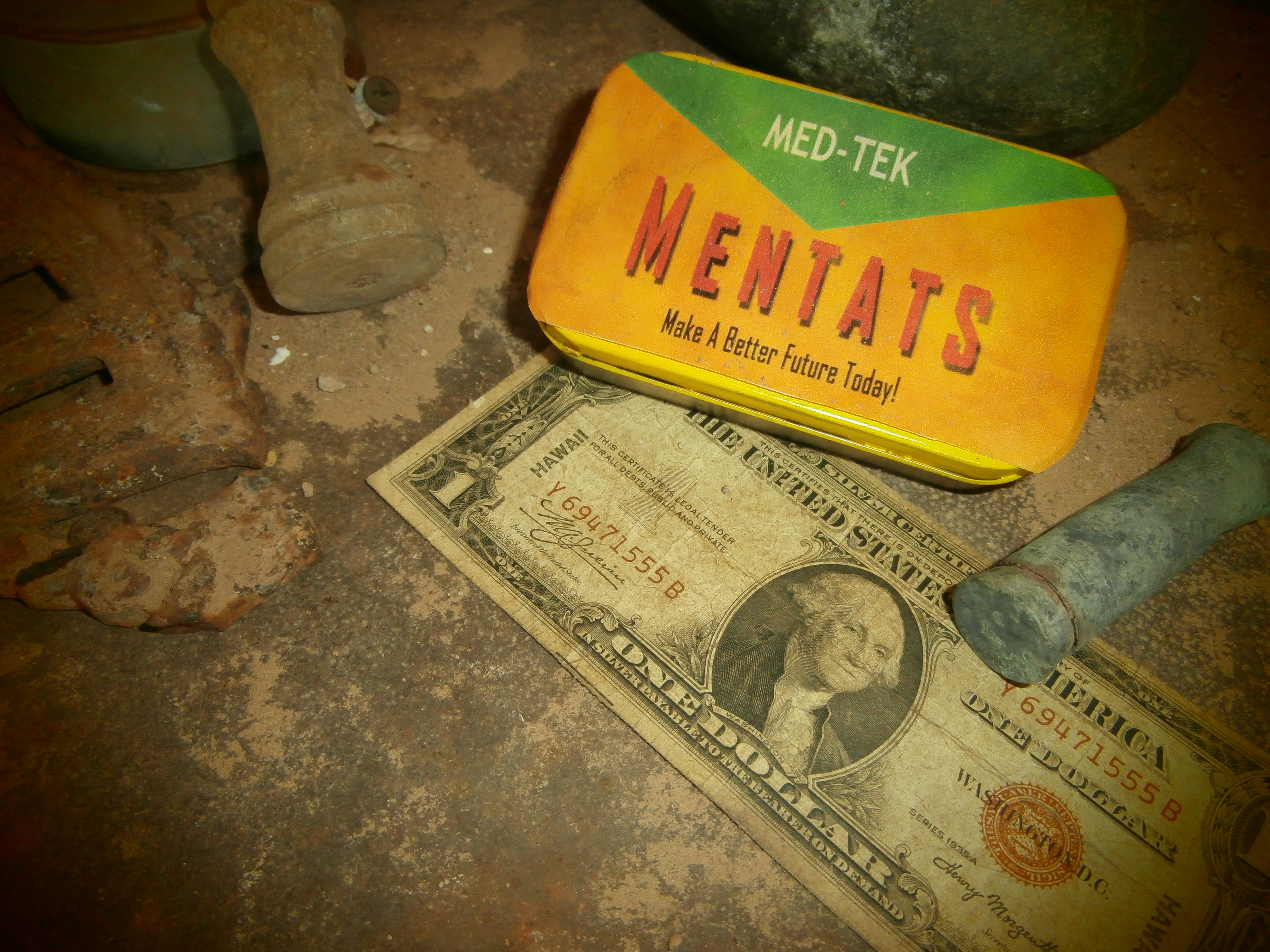 Description: A metal container with a money and a knife on top of it next to a fake money bill and a rubber rubber knife.
