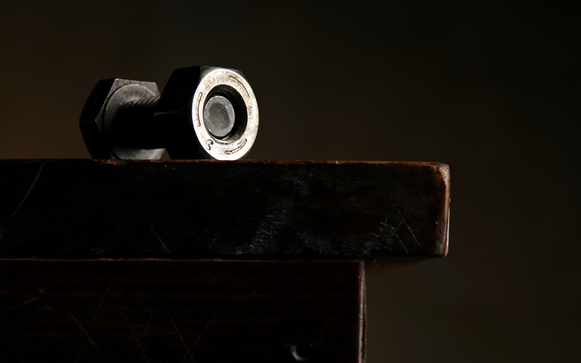 Description: A close up of a metal object on a table with a dark background and a light from the window.