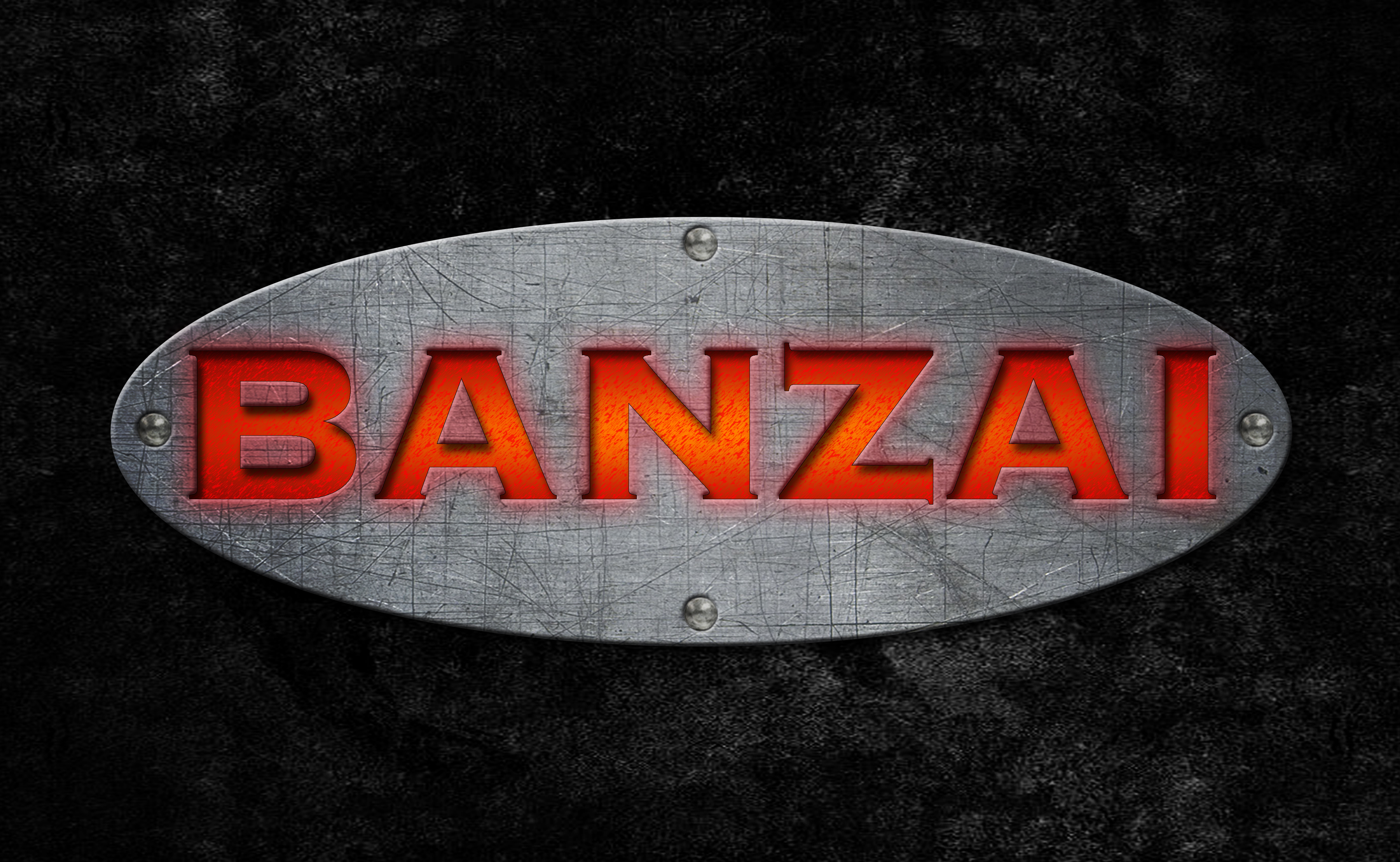 Description: A metal sign that says banzaii on it's side in red light on a black background.
