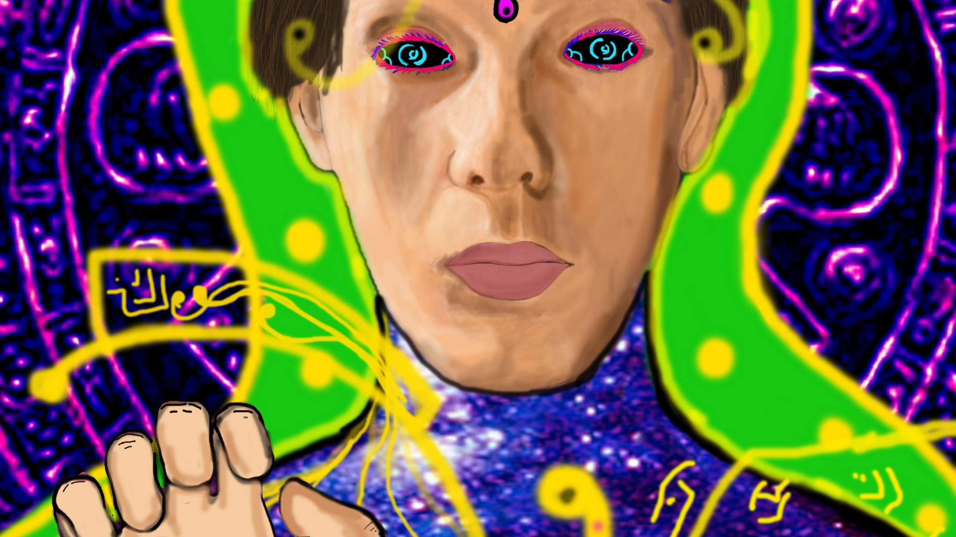 Description: A digital painting of a man with a green jacket and a purple background with yellow circles around him and a green and blue background with a yellow circle.