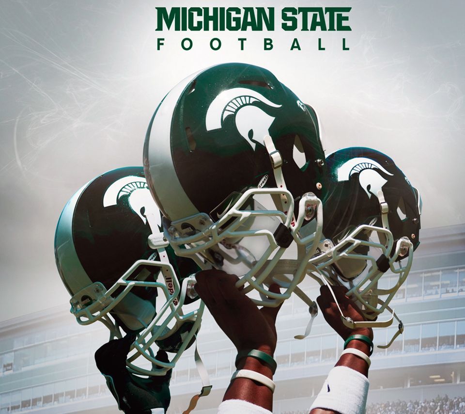 Description: A poster of michigan state football helmets on a football field with the michigan state logo on it's helmet.