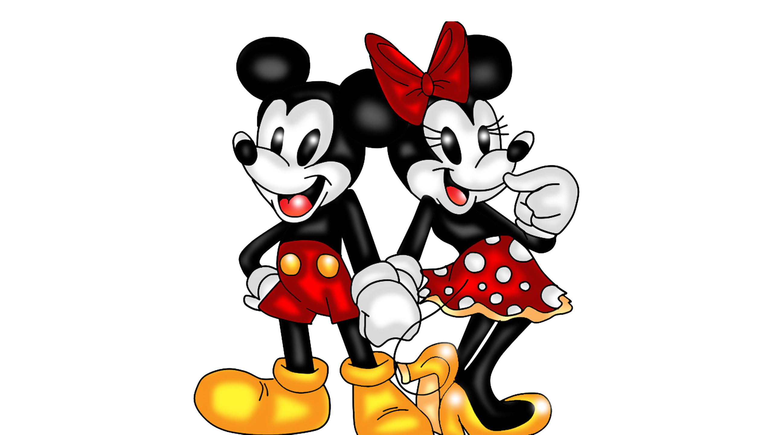 Description: Two cartoon mickey and minnie mouses with a red bow on their heads and a yellow shoe on their feet.
