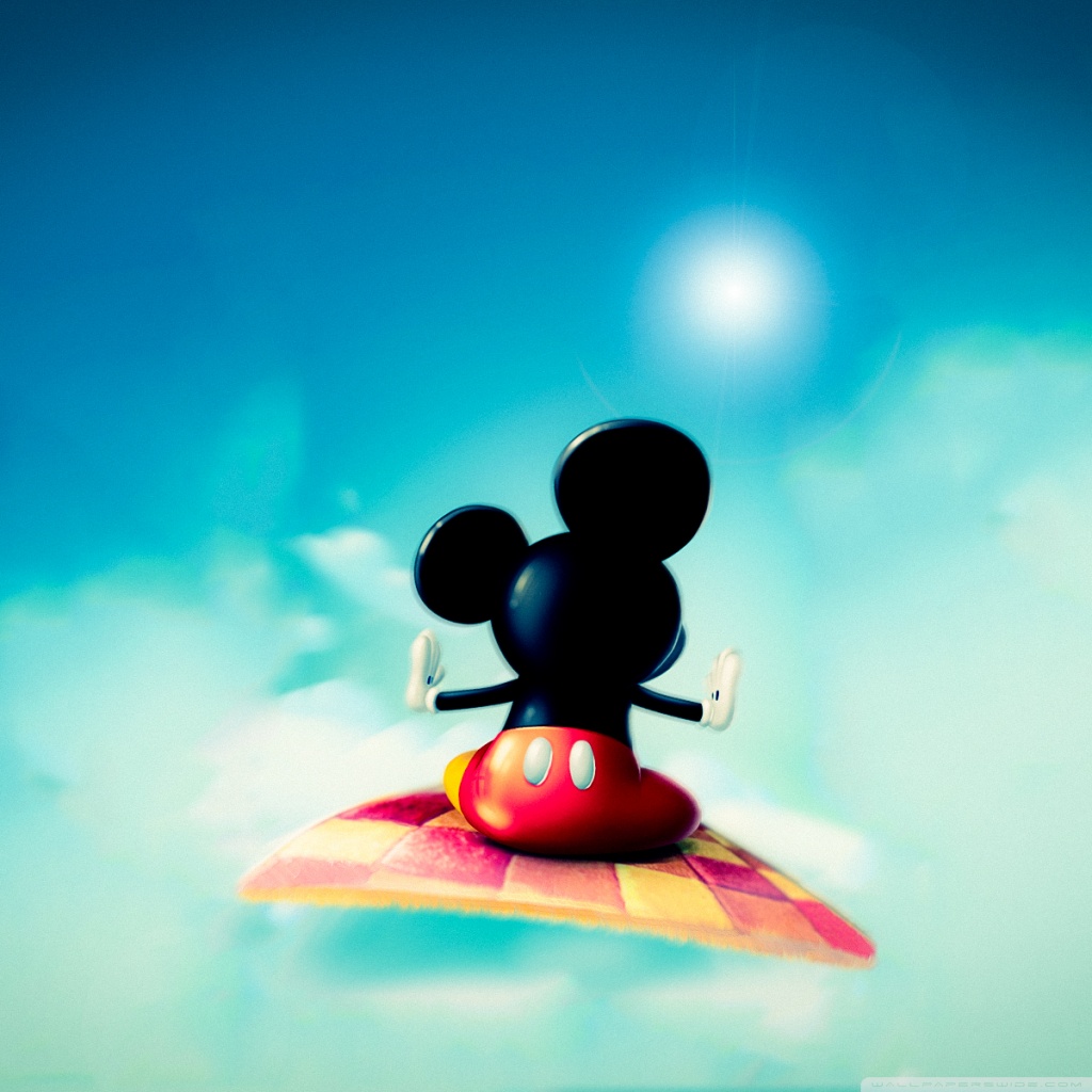 Description: A mickey mouse sitting on top of a red object in the sky with a bright blue sky behind it.