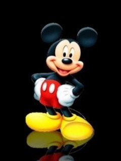 Description: A mickey mouse with a red and yellow mickey mouse on it's back legs and a black background.