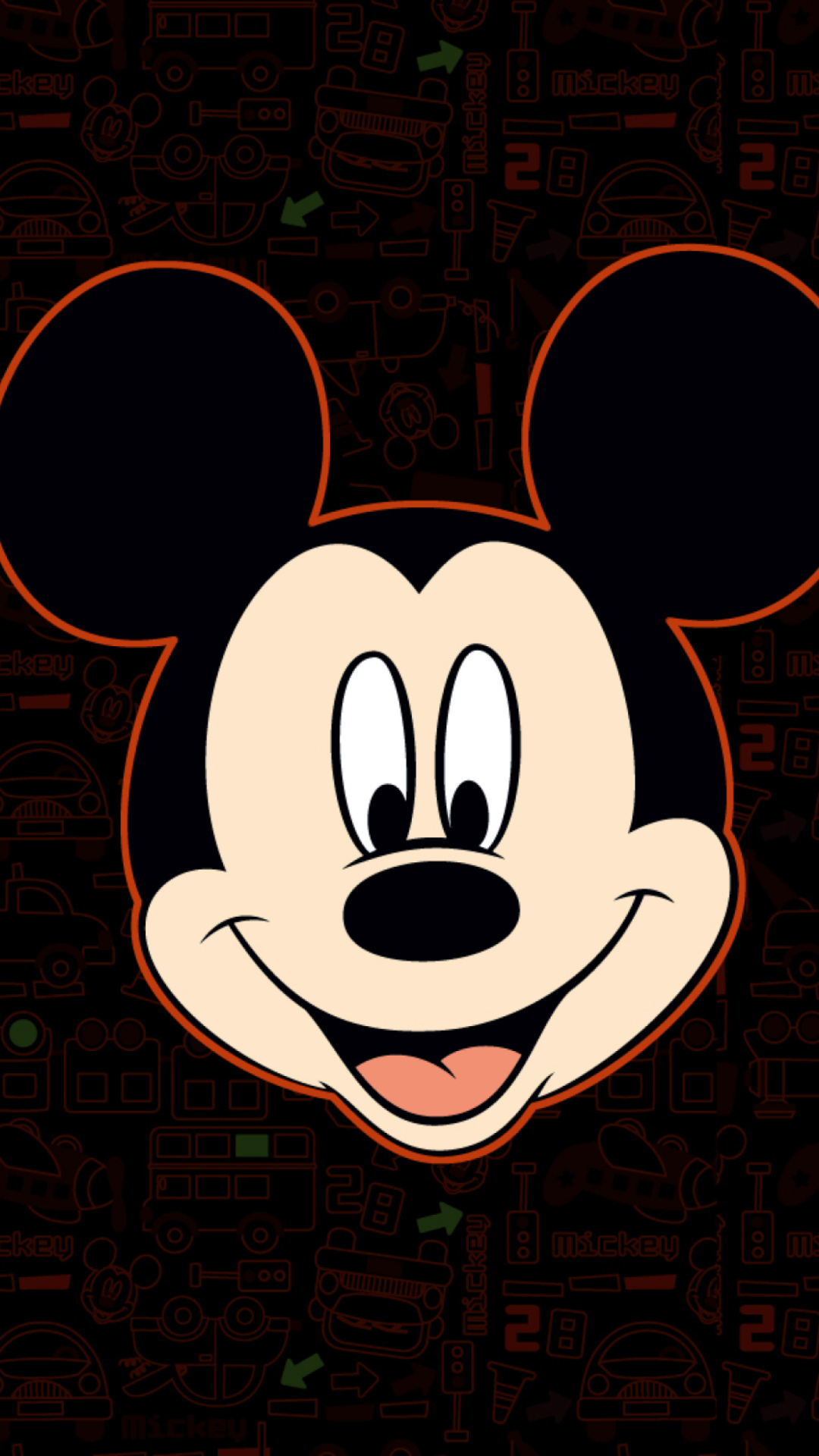 Description: A mickey mouse face with many different symbols around it and a black background with orange and red lettering on it.