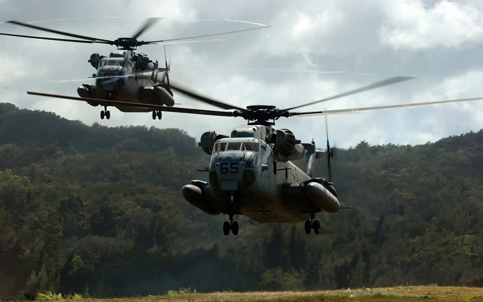 Description: Two military helicopters flying over a lush green forest covered hillside under a cloudy sky with trees in the background.