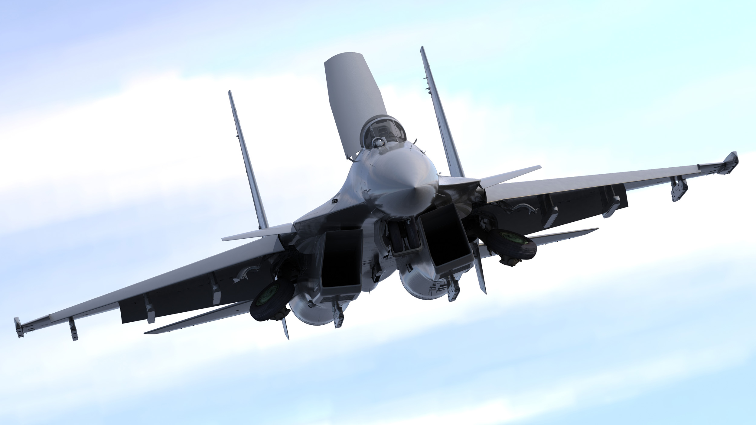Description: A military jet flying through a blue sky with clouds in the background and a camera on the wing of the plane.