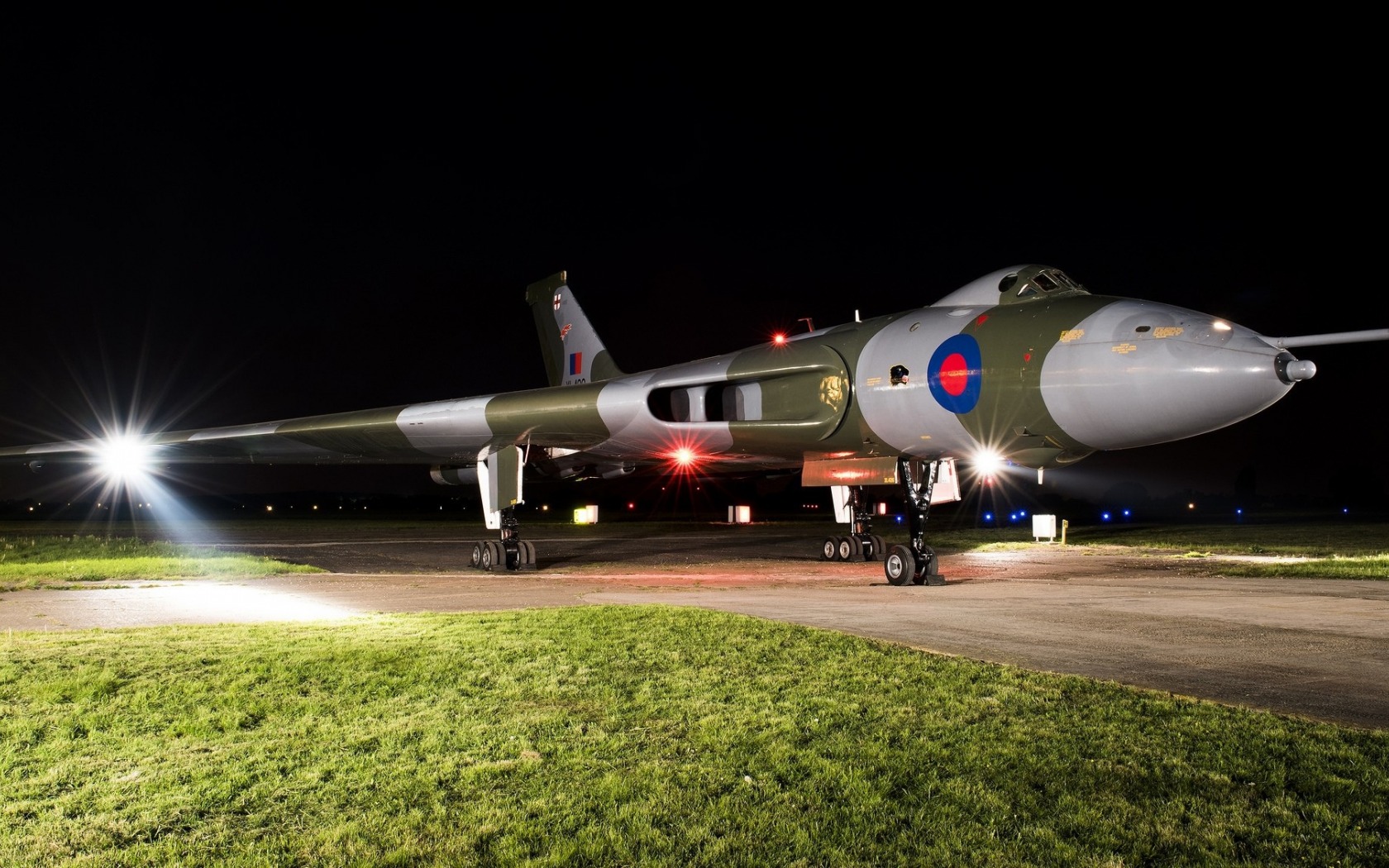 Description: A military jet sitting on top of a runway at night time with lights on it's side and a green grass area.