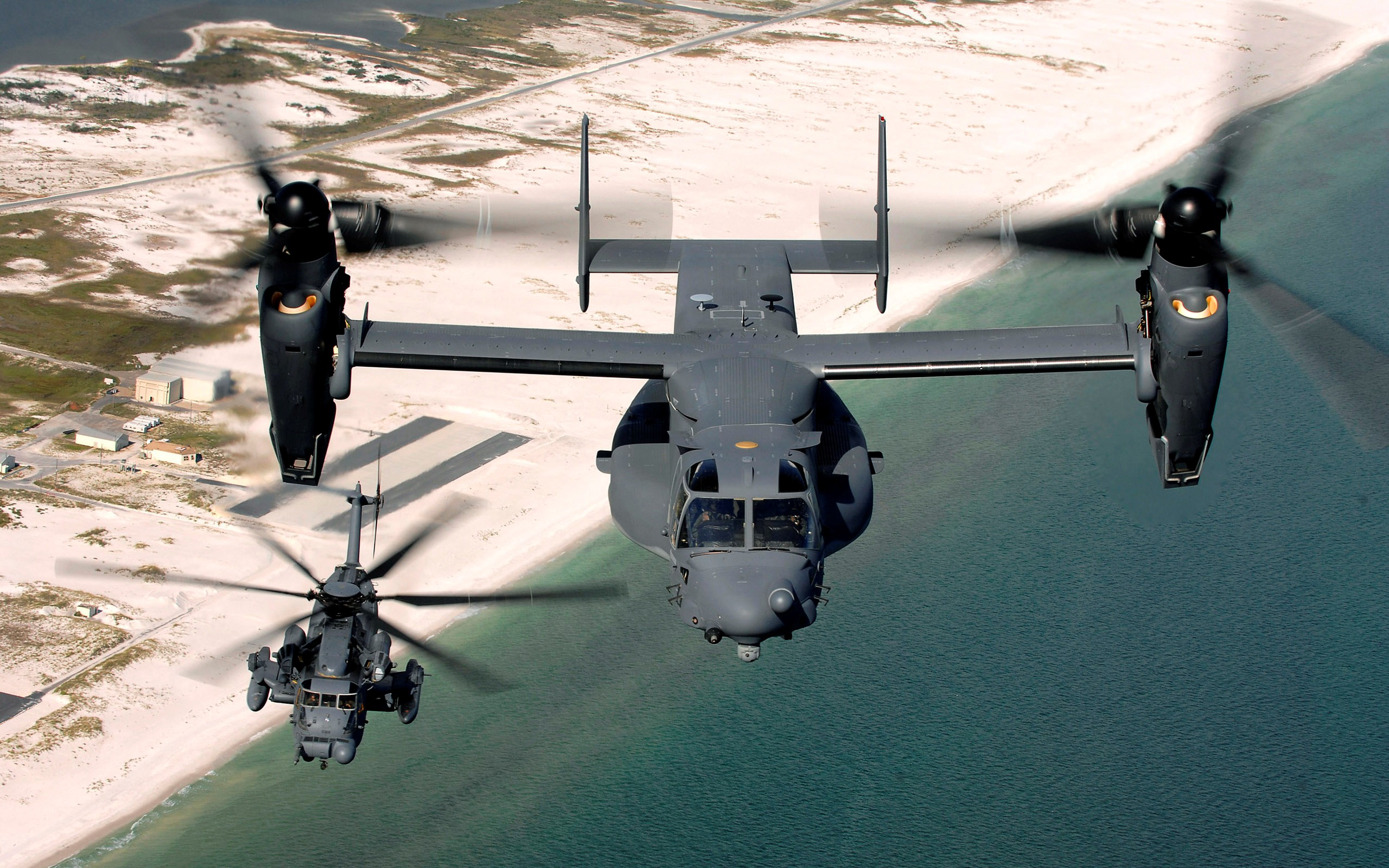 Description: A large military plane flying over a beach and ocean area with a helicopter in the air above it and a beach in the background.