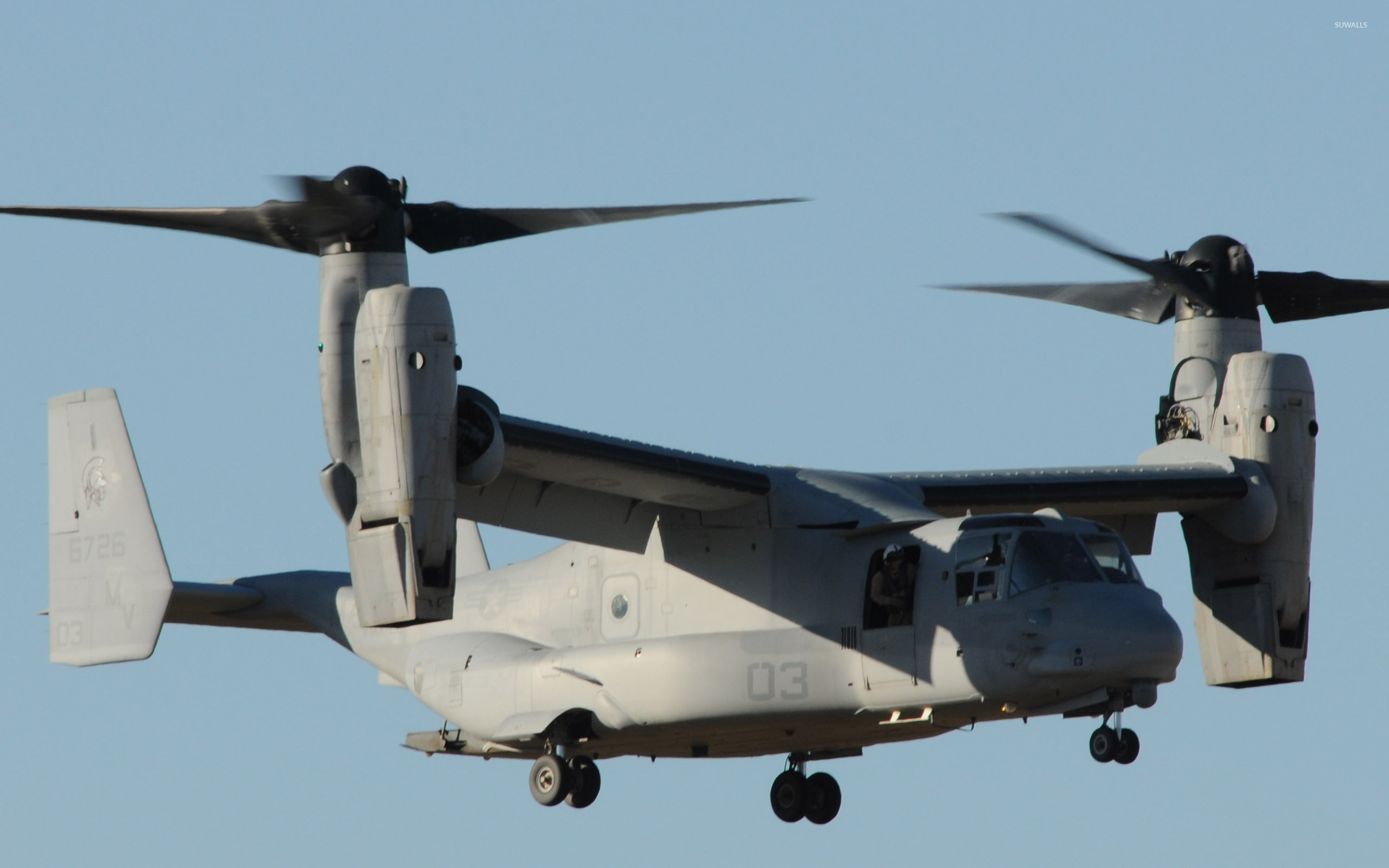 Description: A large military plane flying through a blue sky with propellers on it's wings and a propeller on the front of the plane.