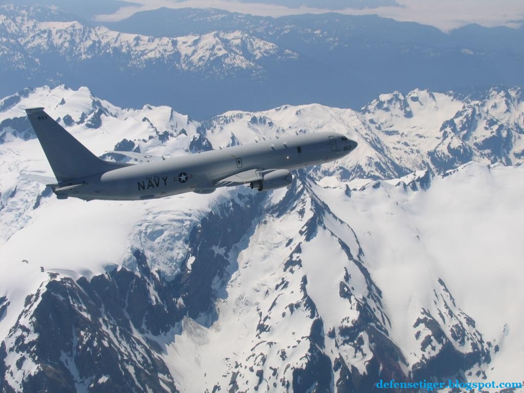 Description: A large military plane flying over a mountain range in the sky with a mountain range in the background and snow covered mountains in the foreground.