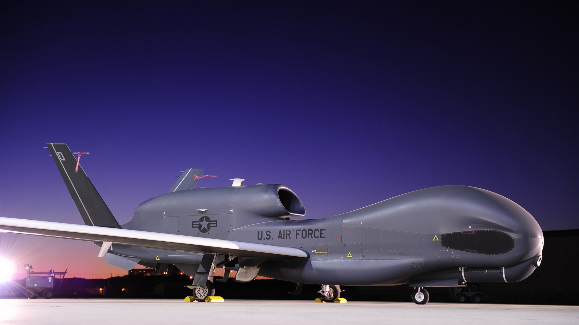 Description: A large gray military plane parked on a runway at night time with a bright light on the side of the plane.