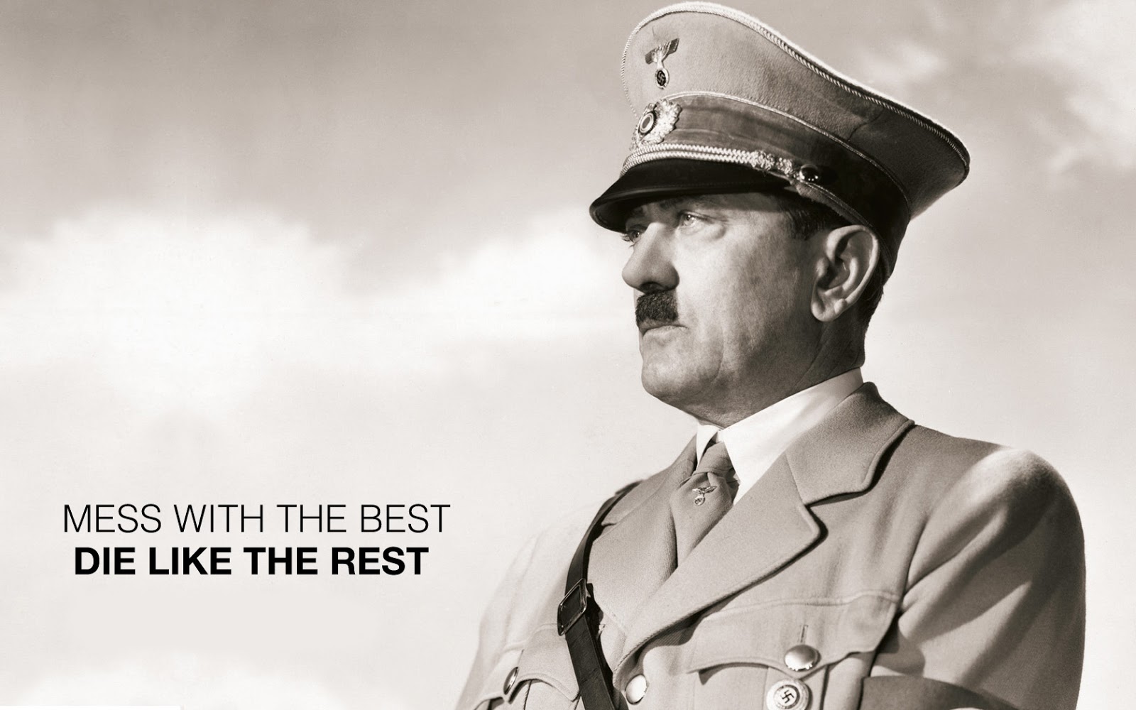 Description: A man in a uniform with a quote on it that says mess with the best die like the rest.