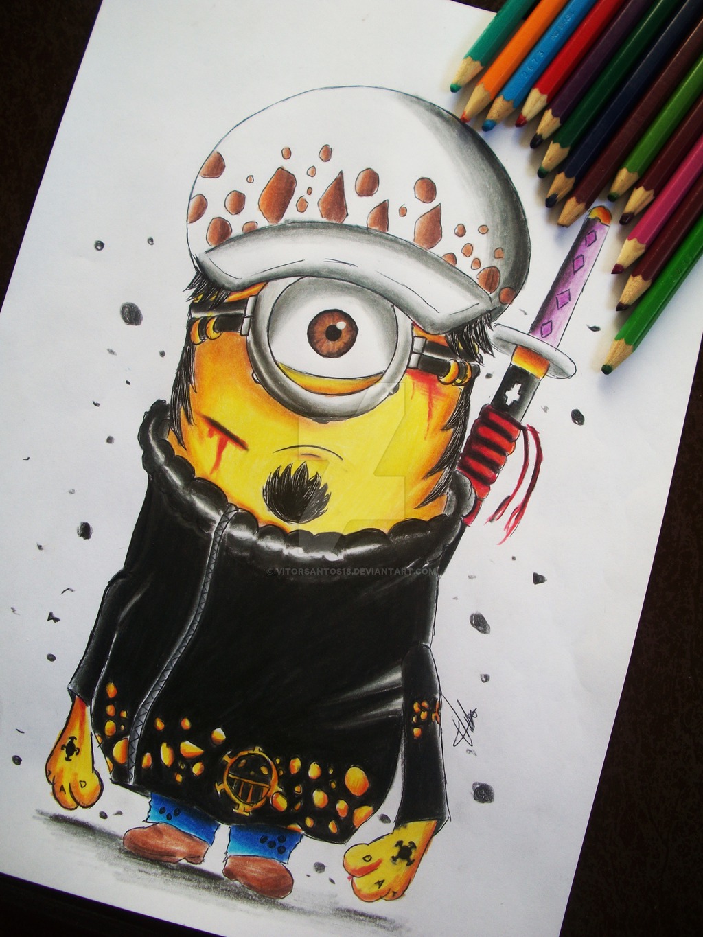 Description: A drawing of a minion with a hat and a knife in his hand and colored pencils in the background.