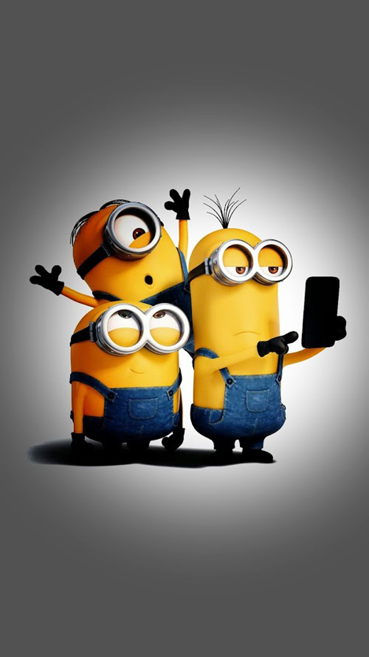 Description: Two minions holding a cell phone in their hands and pointing at it with both hands.