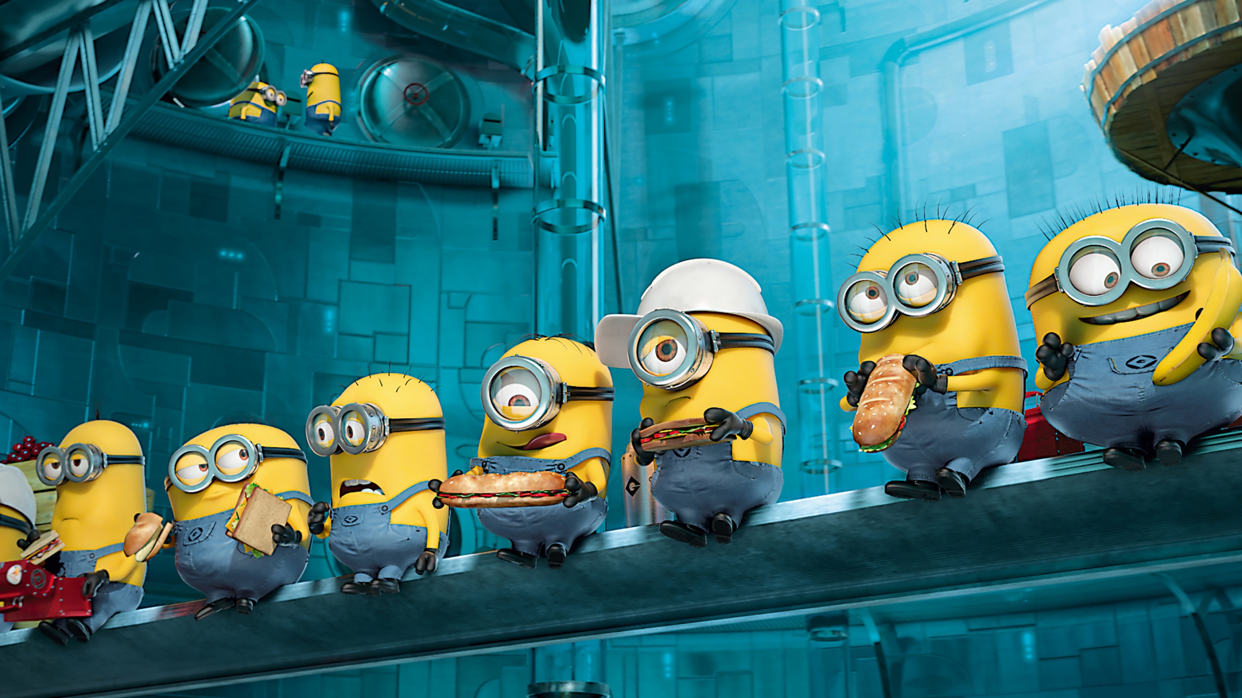 Description: A group of minion characters lined up on a ledge in a scene from the movie despicable me.
