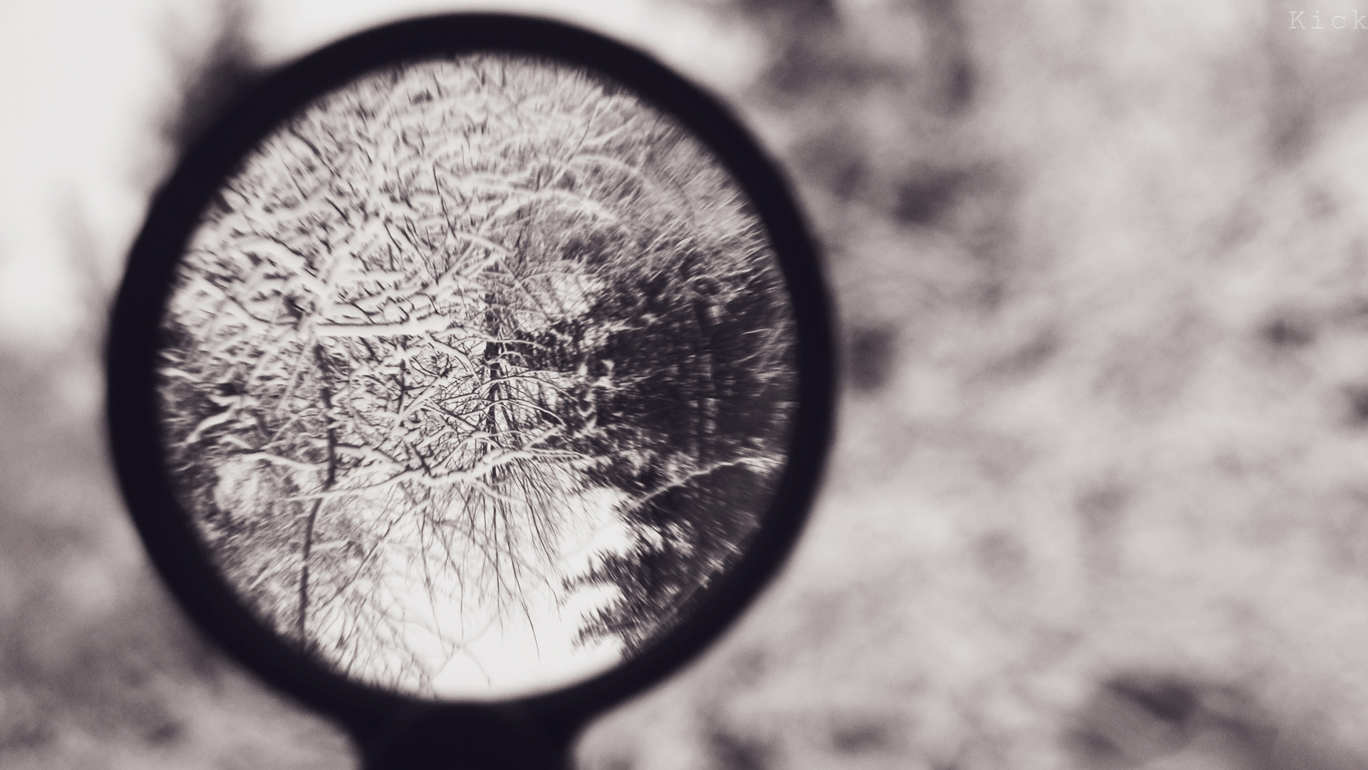 Description: A close up of a mirror with trees in the background and a blurry image of trees in the background.