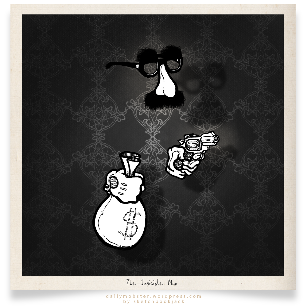 Description: A drawing of a bag of money and a gun with a pair of sunglasses on it.