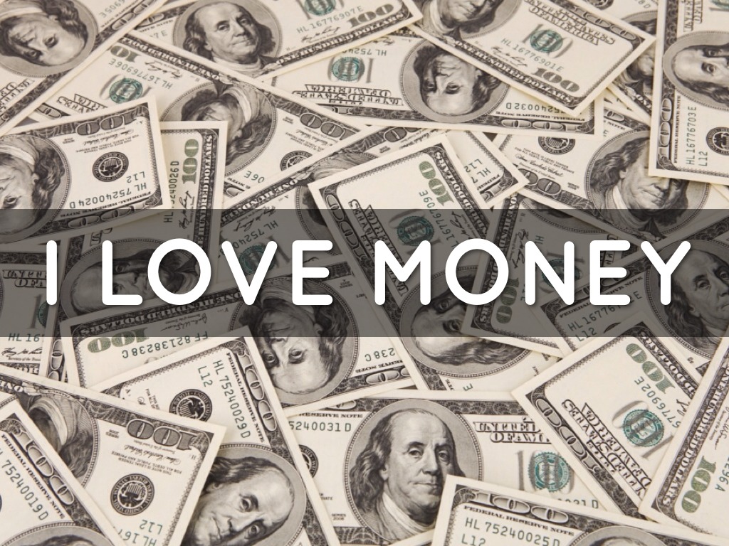 Description: A pile of money with the words i love money on it in white lettering over a background of hundred dollar bills.