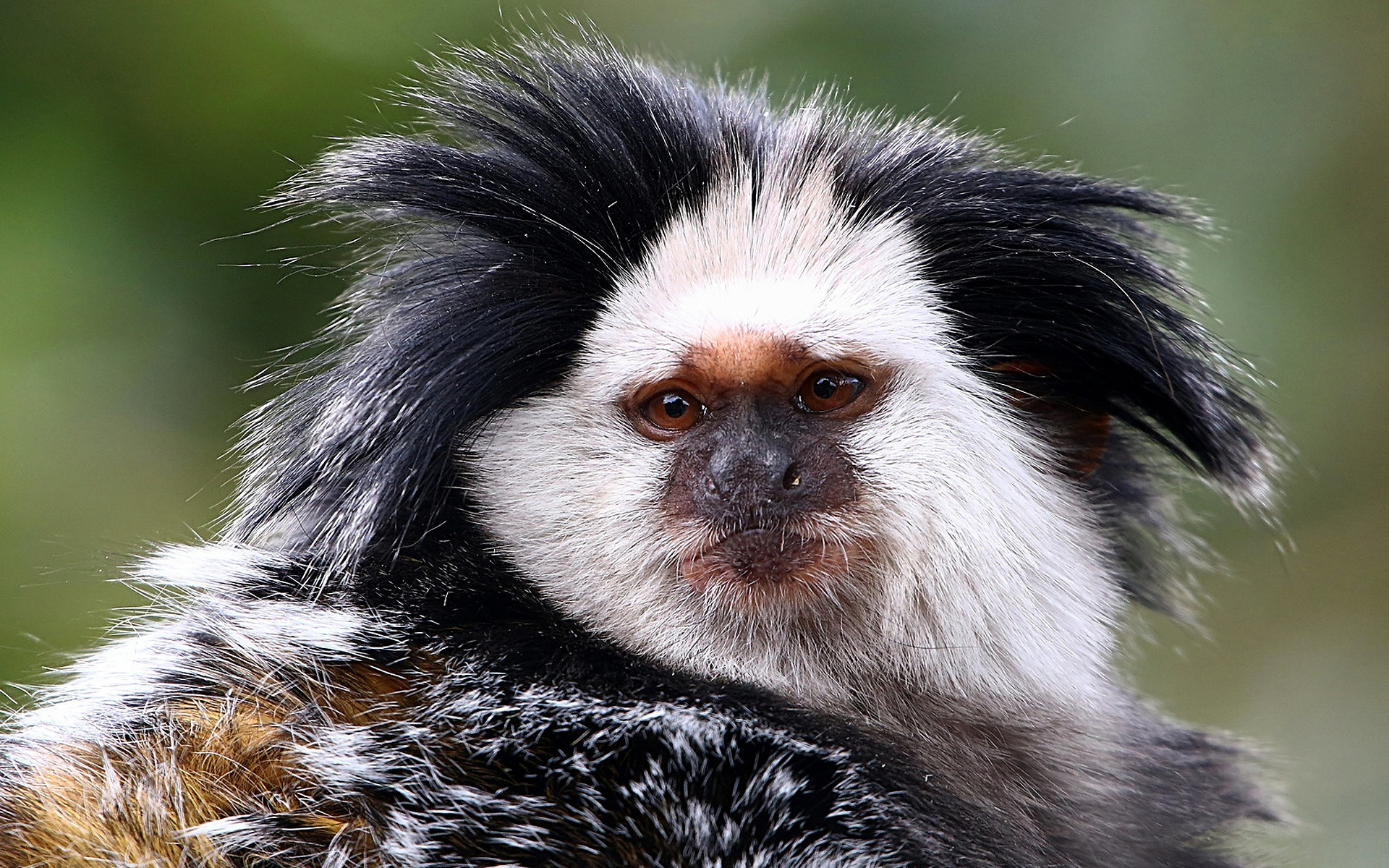 Description: A close up of a monkey with a blurry background of trees in the background and a blurry background.