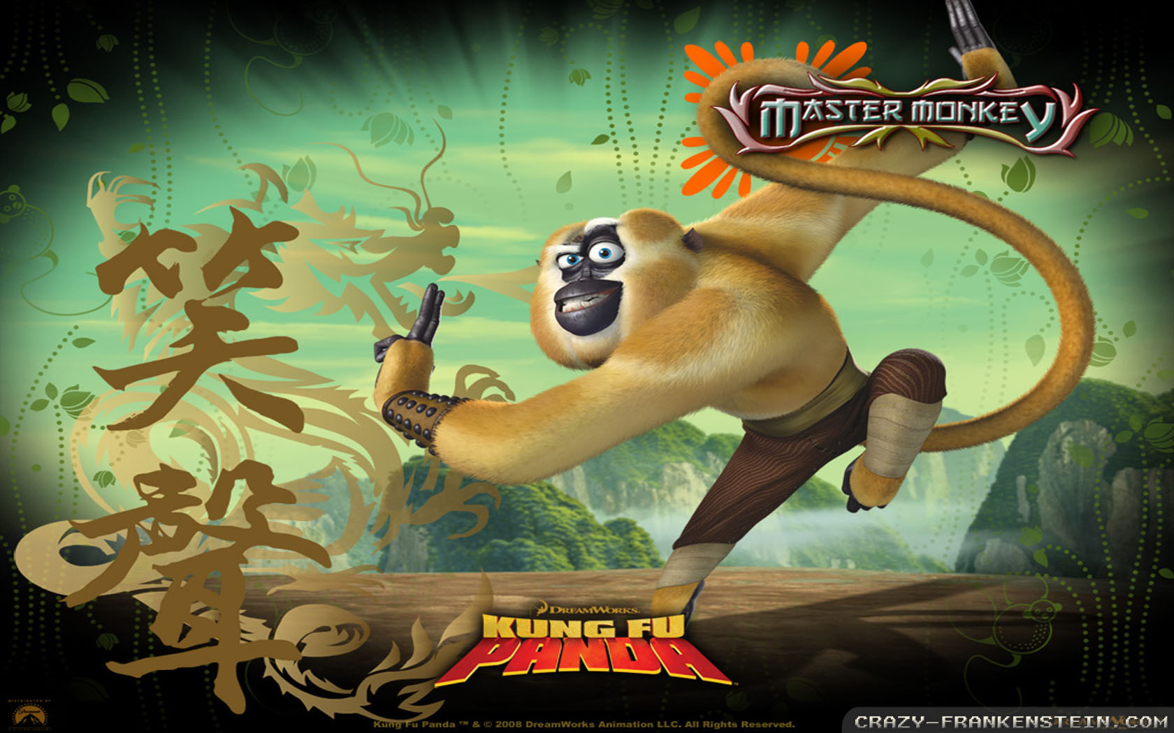 Description: A monkey holding a gun and a bottle of beer in its hand while flying through the air with a monkey on his back.