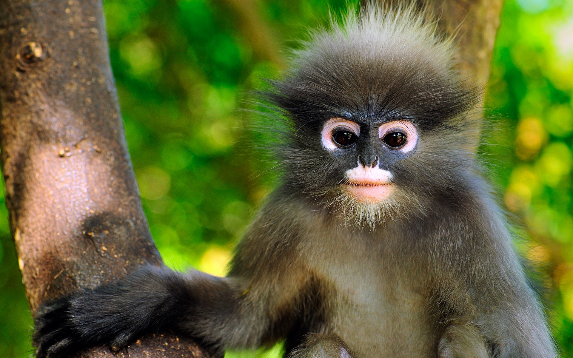 Description: A monkey with a long tail sitting on a tree branch with its eyes wide open and a blurry background.