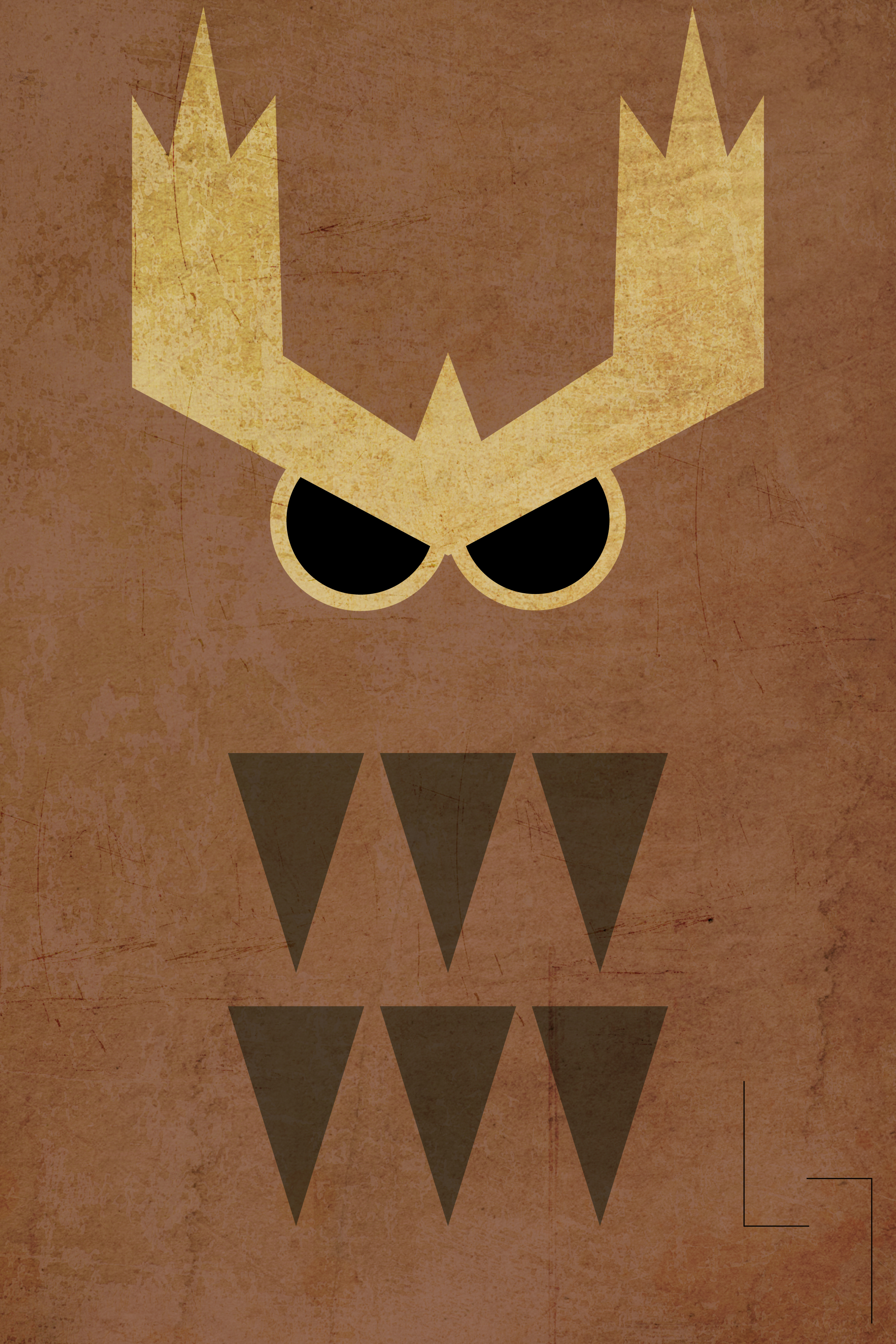 Description: A poster of a monster with big eyes and a big nose with a triangle pattern on it's face.