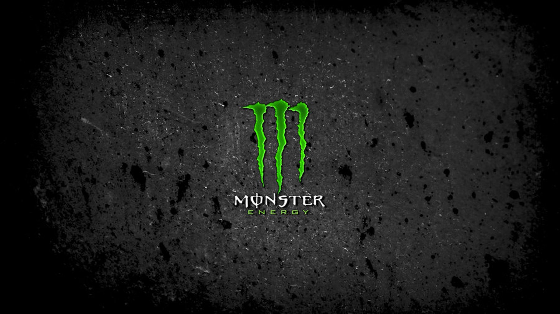 Description: A monster logo on a black background with green paint splatters on it and the words monster energy.