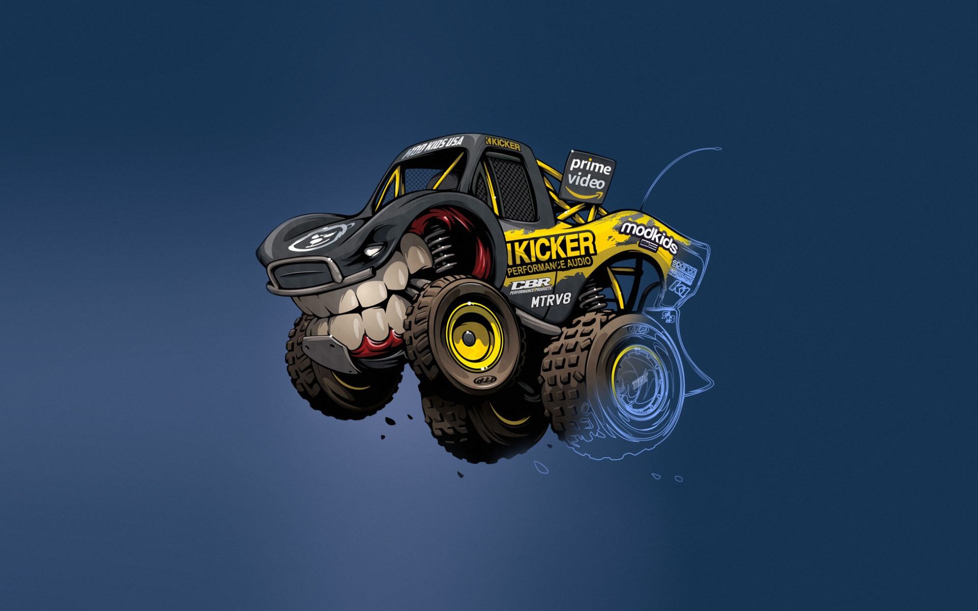 Description: A monster truck flying through the air with a blue background and a yellow and black design on the front.